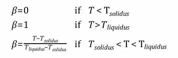 从这里能够明显看到,Fluent直接通过温度来判断物质是处于液态还是固态。当温度T低于固相线温度Tsolidus,则凝固,液相体积分数为0,同时孔隙率也为0,表示全是固态,不流动;