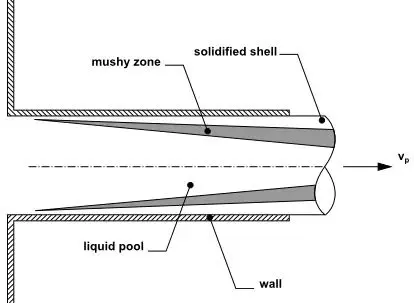 其中,β是液体体积分数,ε是防止除以零的小数 (0.001),Amush是糊状区常数,Vp是连铸拉速(称为pull velocity),是把铸坯从结晶器中拉出的速度。