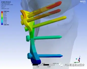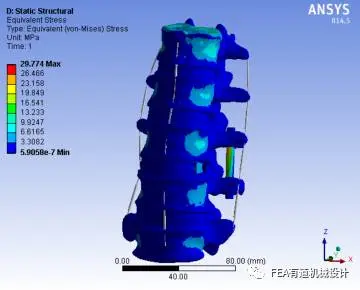 以三维CT扫描数据为源数据,构建脊柱三维模型,对模型添加内固定装置然后导入有限元分析软件,赋予各椎体、椎间盘、终板、固定螺钉等材料的属性,使用Spring单元模拟韧带,分析其在直立,前屈,后伸,侧弯,旋转情况下各椎体及固定装置的受力及位移分布情况。