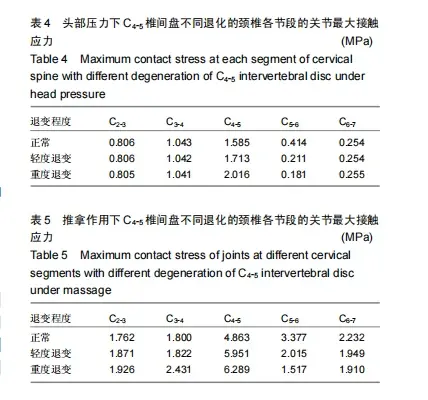 同样,推拿作用下的C4-5关节接触应力随退化程度增加也增大,其余节段影响不明显,见表5。