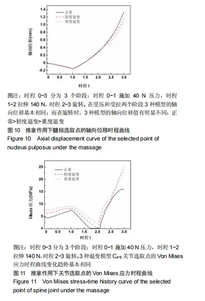 结果与结论:①退化后的椎间盘应力重新分布,髓核承载力减小,纤维环承载力显著增加,关节应力也增大;②在正常承载下,纤维环应力集中区域主要在人体后侧边缘,随着退化程度增加,应力集中区域从边缘向内延伸且面积增大;③推拿旋转时,纤维环应力集中区域主要在后侧和左右两侧,退化程度越高应力集中区域越大,应力值越大;④推拿旋转时,退化程度越高椎间盘的轴向位移小,变形能力越小;⑤C4-5椎间盘退化会对该节段椎体(C4,C5)最大应力和关节接触力产生影响,且应力值随退化程度增加而增大,但退化对其他节段无明显影响;⑥综合应力安全和变形能力,施加推拿手法时旋转角度应根据退化程度适当减小。
