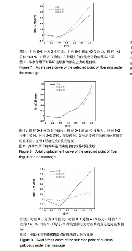 在推拿作用下纤维环选取点的轴向应力时程曲线见图7,由图可知,3种退变的曲线变化趋势基本相同。0-1阶段(受头部压力作用),纤维环最大应力大小为:重度退变>轻度退变>正常;时程为3(即旋转角15°)时,纤维环轴向应力为:重度退变>轻度退变>正常。推拿作用下纤维环选取点的轴向位移时程曲线图见图8,在旋转时,3种退变模型的轴向位移值有明显不同:正常>轻度退变>重度退变。