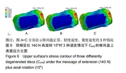 2.2 不同退化模型椎间盘的应力分布 推拿过程中,C4-5 3种退变情况下的椎间盘上表面应力云图分别见图2-6。图2为承受头部压力40 N时,C4-5 3种退变情况的椎间盘上表面应力云图,由图可知,正常、轻度退变、重度退变模型的椎间盘在左上边缘处均有应力集中区域,但2种椎间盘退变模型在左下边缘也出现应力集中现象,并且2种退变椎间盘的应力集中区域面积明显大于正常模型。图3显示颈椎受拉140 N,3种退变情况下的C4-5椎间盘上表面应力云图,由图可知受拉牵引时,应力较大区域集中于左上边缘处,最大Von Mises应力:重度退变>轻度退变>正常。