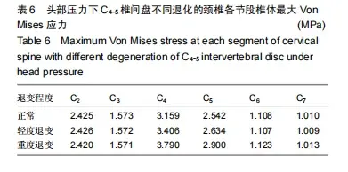 头部压力下,C4-5椎间盘不同退化颈椎各节段椎体最大Von Mises应力见表6,数据对比可知,C4-5椎间盘退化主要对该椎间盘相连的上下椎体,即C4,C5椎体有明显影响,且退化越严重椎体的应力越大,而对其他椎体影响不明显。