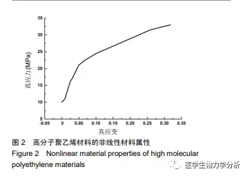 将生成的stl.文件导入 到Abaqus软件,对模型进行赋值与装配。在膝关节假体中, 股骨组件通常选用钴铬合金,胫骨垫衬的材料通常选用高分 子聚乙烯[22-23]。钴铬合金的材料属性为线弹性,各向同性, 密度为8.9×103 kg/m3,弹性模量为209 GPa,泊松比为 0.31[24]。高分子聚乙烯垫片定义为非线性材料[25],其材料属 性见图2,