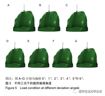 方法:将膝关节假体的模型导入到 Abaqus 三维有限元软件中,将步态过程中的轴向载荷偏移 0°,1°,2°, 3°,4°,5°和 6°形成 7 种不同工况,研究不同工况下胫骨垫衬上的接触压力、面积与接触压力分布的变化。