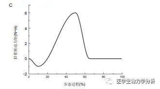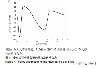 1.4.2 加载方式及边界条件 考虑到人工膝关节置换是为 了让患者能尽量恢复到自然膝关节的运动状态,且减缓患者 的病痛。依据ISO14243-3:2014标准提供的步态数据[31],以 及Lafortune等[32]的研究可知,膝关节假体的运动状态分为膝 关节的伸展与弯曲,胫骨的内外旋转和胫骨的前后移动。因 此,该模型设置假体股骨组件可以在竖直轴线方向自由平 动,也可以做伸展-弯曲运动和外翻-内翻运动,胫骨组件可 以在水平面上自由运动,载荷数据具体见图4 [33]。
