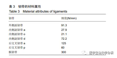 考虑到韧带组织只能承受拉力不能承受压力, 且根据Taylor等[30]的研究表明韧带部分为非线性材料,因此 使用非线性弹簧单元来模拟韧带组织。包括内侧副韧带(内 侧副韧带a,内侧副韧带o,内侧副韧带d)、外侧副韧带、后 交叉韧带(后交叉韧带a,后交叉韧带p)、髌韧带(PL),材料 属性见表3。