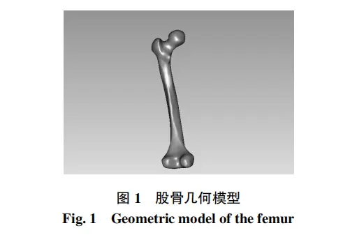 1.1 几何模型的重构 本文建立模型所需的几何数据来自于一名健康 6 岁儿童的下肢右股骨颈,前期处理为导入 1,mm 层 厚的 CT 数据,输出为 DICOM 格式的文件,导入 MIMICS 三维医学建模软件,采用阈值分割的方法提 取相关的解剖学结构,为建立有限元模型作前期准 备.几何模型的质量对于有限元模型的有效性是至 关重要的.MIMICS 处理后的几何模型比较粗糙,不 适合直接导入有限元分析软件进行网格划分,所以将 经过 MIMICS 处理后输出的 STL 格式三维几何模型 导入逆向工程软件 Geomagic 中作光滑处理,并生成 带有非均匀有理B样条曲面 NURBS(non-uniform rational B-splines)的 IGES 格式的三维几何模型,为 有限元网格划分作准备.图 1 为经 Geomagic 处理的 较光滑的几何模型.