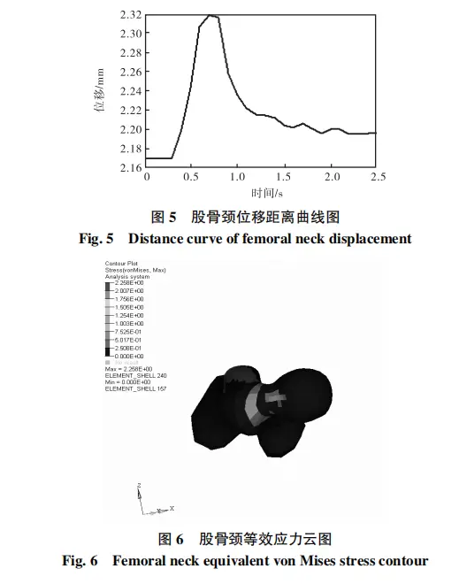 模型前处理加载完成后,将其导入 LS-DYNA 软 件中进行仿真分析.计算结果表明:股骨颈处最大位 移为 2.32,mm,如图 5 所示.图 6 为经过仿真分析后 的股骨颈等效应力云图.可以看出,应力集中发生在 股骨颈外侧