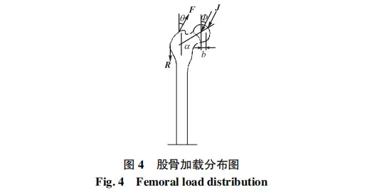 模拟交通事故中儿童由于车辆碰撞而跌倒,获得 较高初速度并于地面碰撞,从而股骨大转子受力超过 耐受限制而造成的股骨颈骨折.根据儿童股骨上端股骨颈解剖结构和生物力学特点,采用一种简化受力 模型模拟儿童股骨与地面碰撞的情况,实验对股骨头 模型施加全约束,受力情况如图 4 所示[8–9].其中:F 为外展肌群肌力,1,108,N;R 为髂胫束肌力,120,N;J 为股骨头传递的关节力,1,588,N;θ=30°;Φ=25°; α=135°.文中为模拟与地面碰撞,将股骨头传递的 关节力向右平移 b=6,mm,如图 4 中虚线所示.