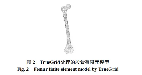 将 IGES 格式的三维几何模型导入 TrueGrid 软 件,应用 BLOCK、CURD、CURS 等命令生成初始六 面体网格,进行曲面片的重构以及基于重构的曲面片 进 行六面体网格的网格投影操作 ,首先基于 在 Geomagic 软件中的测量工具测量出股骨长度,进而 估算出需要建立初始六面体网格的大小,由于大多数 情况下导入的几何模型面边界以及形态与 BLOCK 命令所建立的初始六面体网格不匹配,不利于投影的 进行,需要使用 SD 命令生成辅助面以利于找到和股 骨解剖学结构相对应的最佳拟合曲面,从而进行下一 步的网格划分.在进行了初步投影后便得到了较为 粗糙的有限元模型,利用 MSEQ 命令调整节点数以 达到完善有限元模型的效果.图 2 为经过 TrueGrid 处理后的股骨有限元模型.