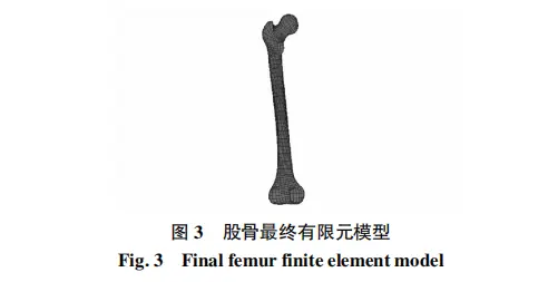 单元质量不但会影响后续仿真碰撞实验中计算 的稳定、时间步长、计算时间、附加质量,而且更重要 的是它会影响计算的精确性.由于 TureGrid 处理后 的模型不能完全符合要求,进行有限元仿真时,需要 将有限元模型划分网格后导入Hypermesh 进行网格质 量的检查以及调整,以完善网格质量,以免在碰撞实 验时模型失效.检查的标准为:雅克比(Jacobian)≥ 0.5,翘曲度(Warpage)≤30°,长宽比(Aspect)≤8,扭 曲度(Skew)≤60°,最小内角(Min Angle)≥30°,最 大内角(Max Angle)≤150°,图 3 为经过 HyperMesh 调整的股骨有限元模型,节点数为 11,529,单元数为 10,416