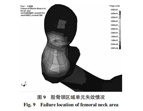 图 9 显示了股骨颈及相关区域单元的失效情 况.股骨颈靠近大转子端相关区域发生了单元失效, 这种现象与相关医学理论由暴力跌倒导致儿童股骨 颈骨折相吻合[8].结果显示的应力集中且单元失效部 位为正常人体解剖学有几何形状突变的部位,这与 Wolff 定律相符合,验证了模型的有效性.