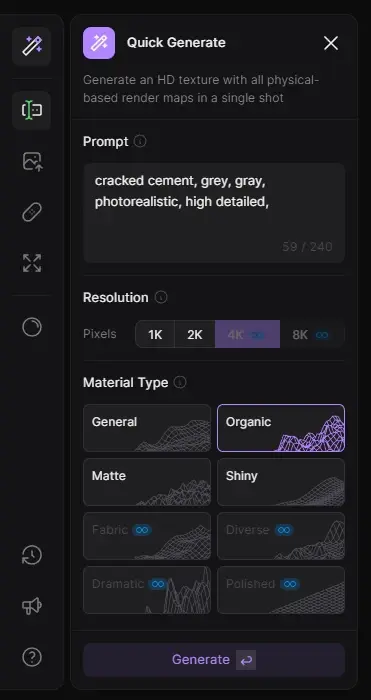 在Resolution这里可以选择纹理的分辨率,1K、2K可以随意选择,4K、8K就需要“钞能力”了,每月收费20刀。