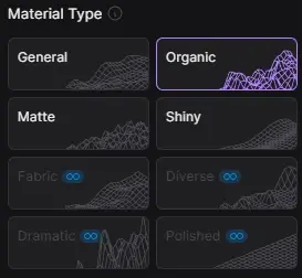 然后是Material Type,这里可以选择材质类型,有普通、有机、哑光、光泽度是可以随意选择的。后面还有织物、抛光等等材质类型同样是需要“钞能力”解锁的。