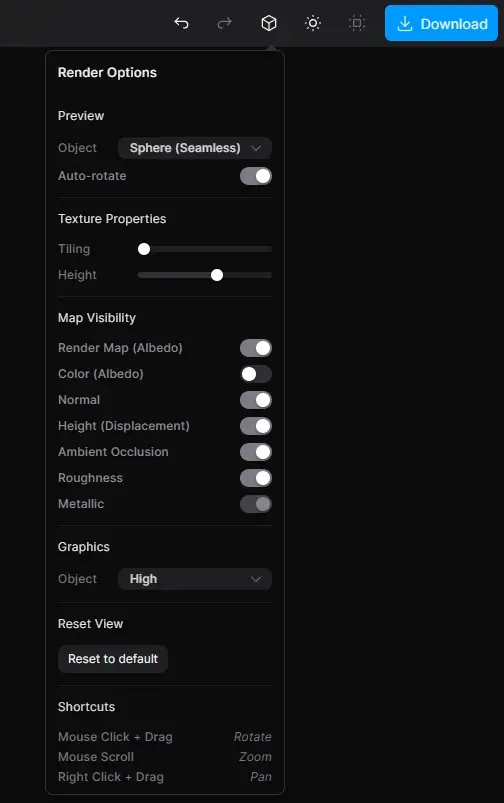 右上角还有渲染选项和照明选项来增强和指导你的纹理生成、编辑和查看体验。