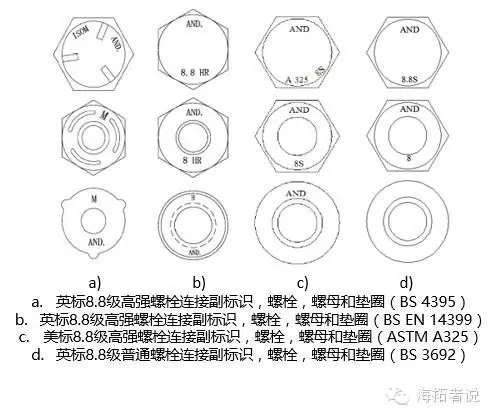 普通螺栓和高强螺栓的标示是对同等级螺栓现场识别的基本方法。由于英美标准中对于高强螺栓扭矩值计算的取值并不相同,所以识别两种标准的螺栓也有必要。