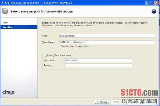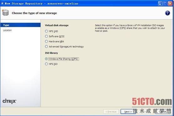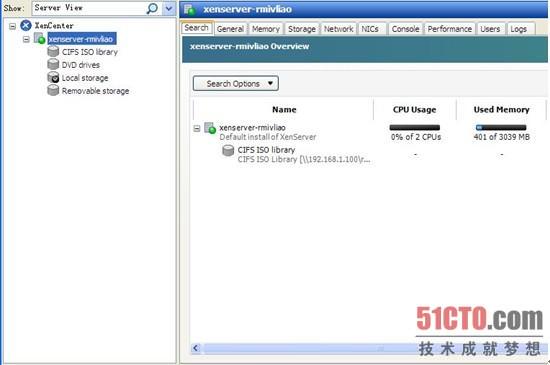 成功后XenServer5.6会添加一个CIFS ISO library的storage,我们可以把这个当成本地目录来使用了。VM的安装媒质可以选用家用Server自带的光驱,也可以用我们新建的storage。