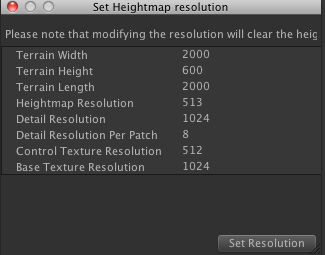 点击Terrain - > set Resolution打开设置地形参数菜单,如下图所示。