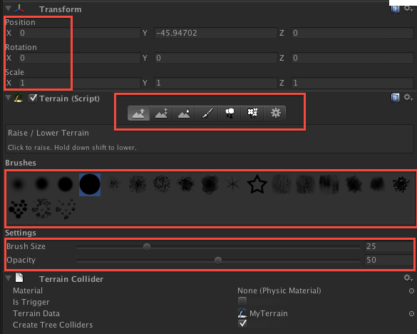 Hierarchy中点击Terrain,Unity编辑器右侧栏中出现地形编辑窗口。下图中红框内是比较重要的一些信息,从上倒下分别为。