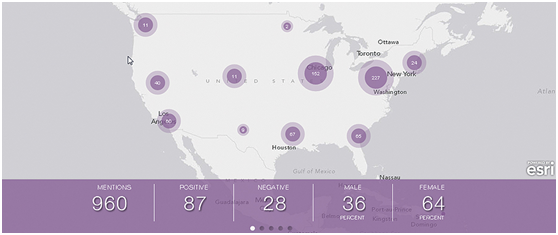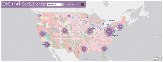 通过与IBM阿尔马登研究中心的加速发现实验室合作,Esri创建了一种称为舆情监控的交互式概念验证(proof-of-concept)地图,使用Tweets和地理空间技术来了解客户情感并聚焦于品牌管理。IBM阿尔马登研究中心的加速发现实验室是进行跨行业大数据分析的最先进的实验室。