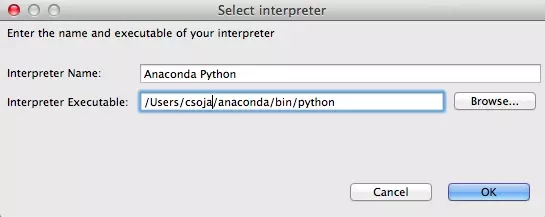 Browse to ~/anaconda/bin/python or wherever your Anaconda Python is installed.