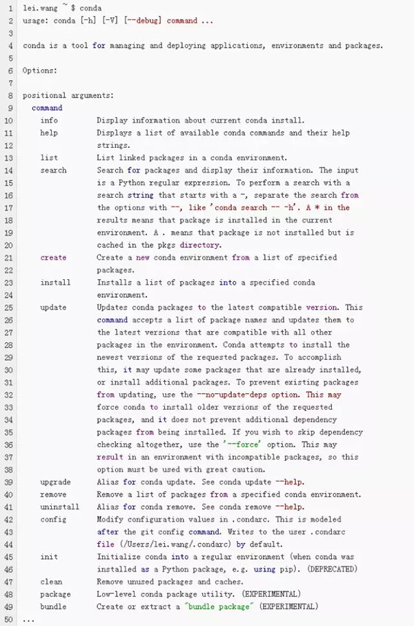 信息太长了,后面的部分就不列举了。不过看到前面这部分选项,就已经足够让我们兴奋了:基本的list,search,install,upgrade,uninstall等功能都包含,说明我们可以向apt-get一样方便管理python的各种依赖了。。。