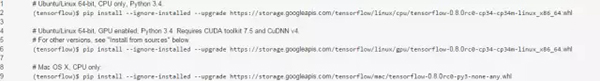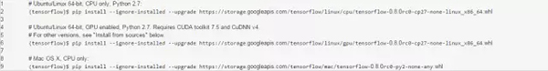 当然上面的命令对应的是python2.7,系统为macos,cpu only。根据tensorflow官方提供的资料,不同的系统与不同的版本命令如下: