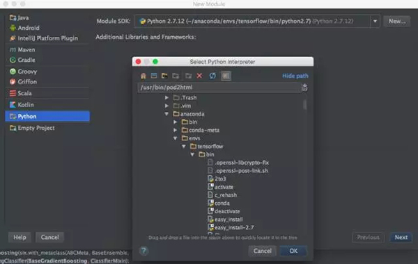 如果我们要写大家伙,一般会用IDE。将tensorflow集成到IDE里,步骤也很简单。以IntelliJ为例,跟创建普通项目唯一的区别就是,创建普通项目的时候我们的Module SDK选项是系统默认的python解释器。如果我们想要使用tensorflow的相关代码,将Module SDK换为刚刚我们新建的tensorflow计算环境即可!