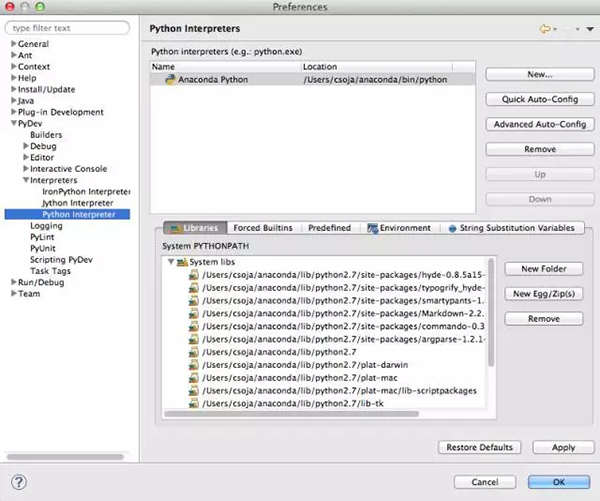After you have Eclipse, PyDev, and Anaconda installed, follow these steps to set Anaconda Python as your default by adding it as a new interpreter, and then selecting that new interpreter: