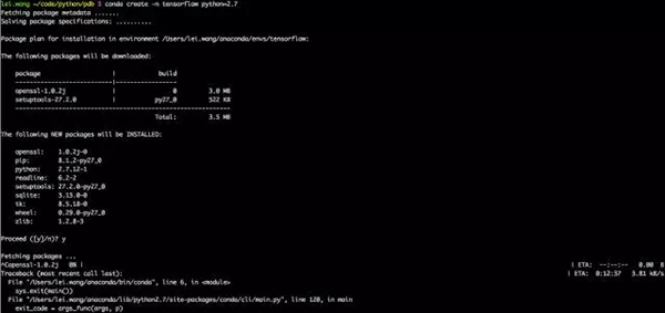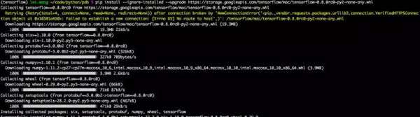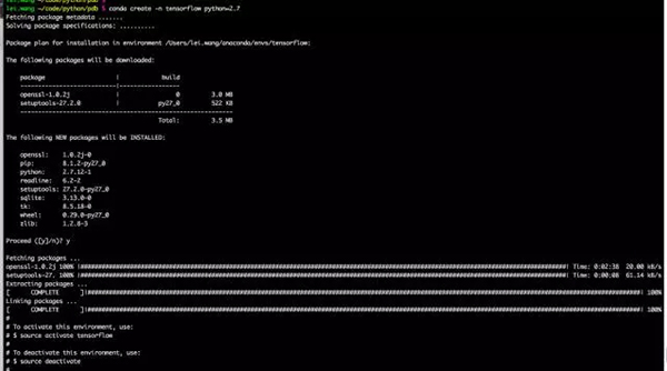用户名前有(tensorflow)的标识。我们这样切换,实际上是更换了环境变量里的pip和python。切换到tensorflow的计算环境以后,然后开始用pip安装: