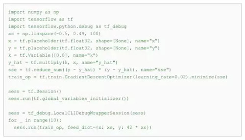 tfdbg 满足了这一运行时调试需求。让我们通过一段简短的代码来了解 tfdbg 的实用效果,这段代码的作用是建立并运行一个简单的 TensorFlow 图表,以通过梯度下降法拟合一个简单的线性方程。