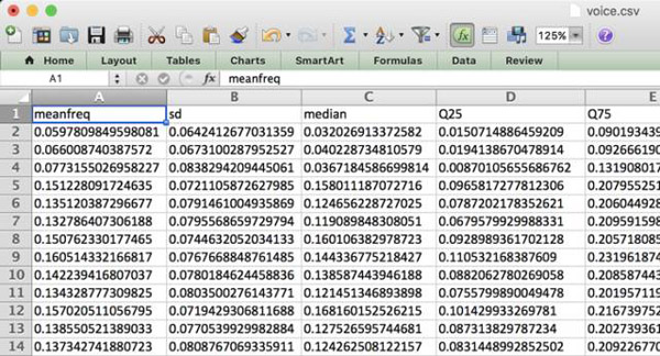 我们首先需要强调这一点,这里列出的并非实际音频数据!相反,这些数字代表着语音记录当中的不同声学特征。这些属性或者特征由一套脚本自音频记录中提取得出,并被转化为这个CSV文件。具体提取方式并不属于本篇文章希望讨论的范畴,但如果大家感兴趣,则可点击此处查阅其原始R源代码。