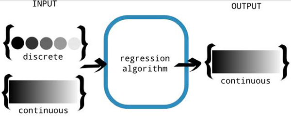 图 2:回归算法是为了产生连续的输出。输入允许是离散的或连续的。这种区别是重要的,因为离散的输出值能更适合分类问题,我们将在下一章中讨论这个问题。