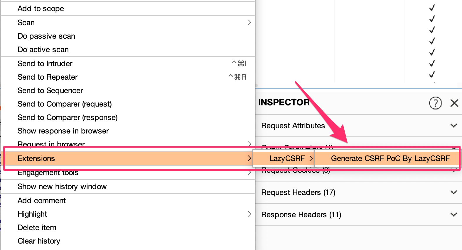 我们可以通过在菜单栏中选择“Extensions -> LazyCSRF -> Generate CSRF PoC By LazyCSRF”来生成一个CSRF PoC。