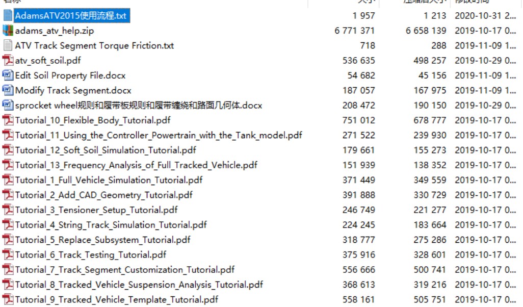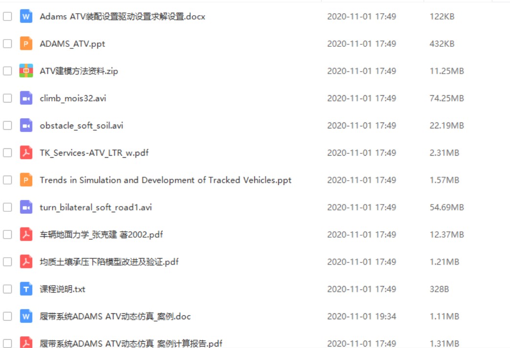 履带系统ADAMS ATV动态仿真案例,包括软地面爬坡转弯越障仿真视频、理论值(实际使用值)与仿真值对比、计算报告、建模方法、软件教程、ATV建模资料;可以指导软件安装、建模答疑;地面力学问题可以适当解答交流。硬地面仿真计算不难实现。资料包较大无法全部上传