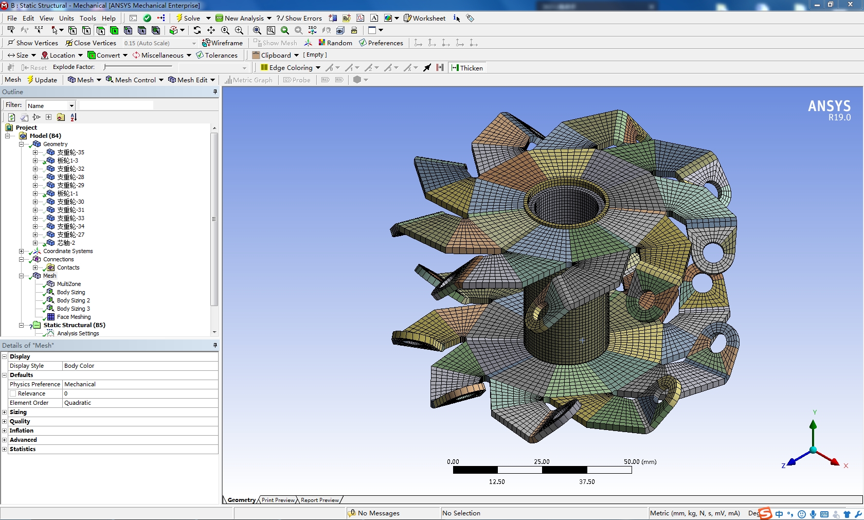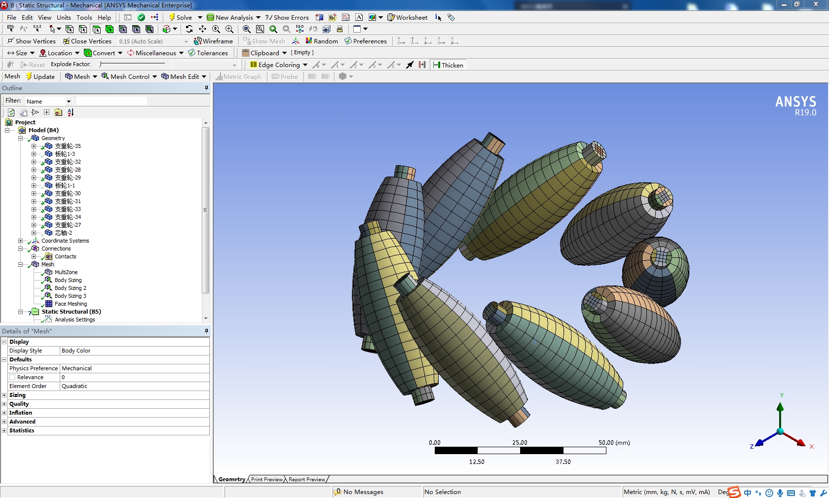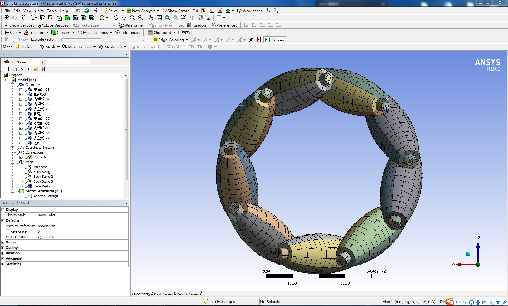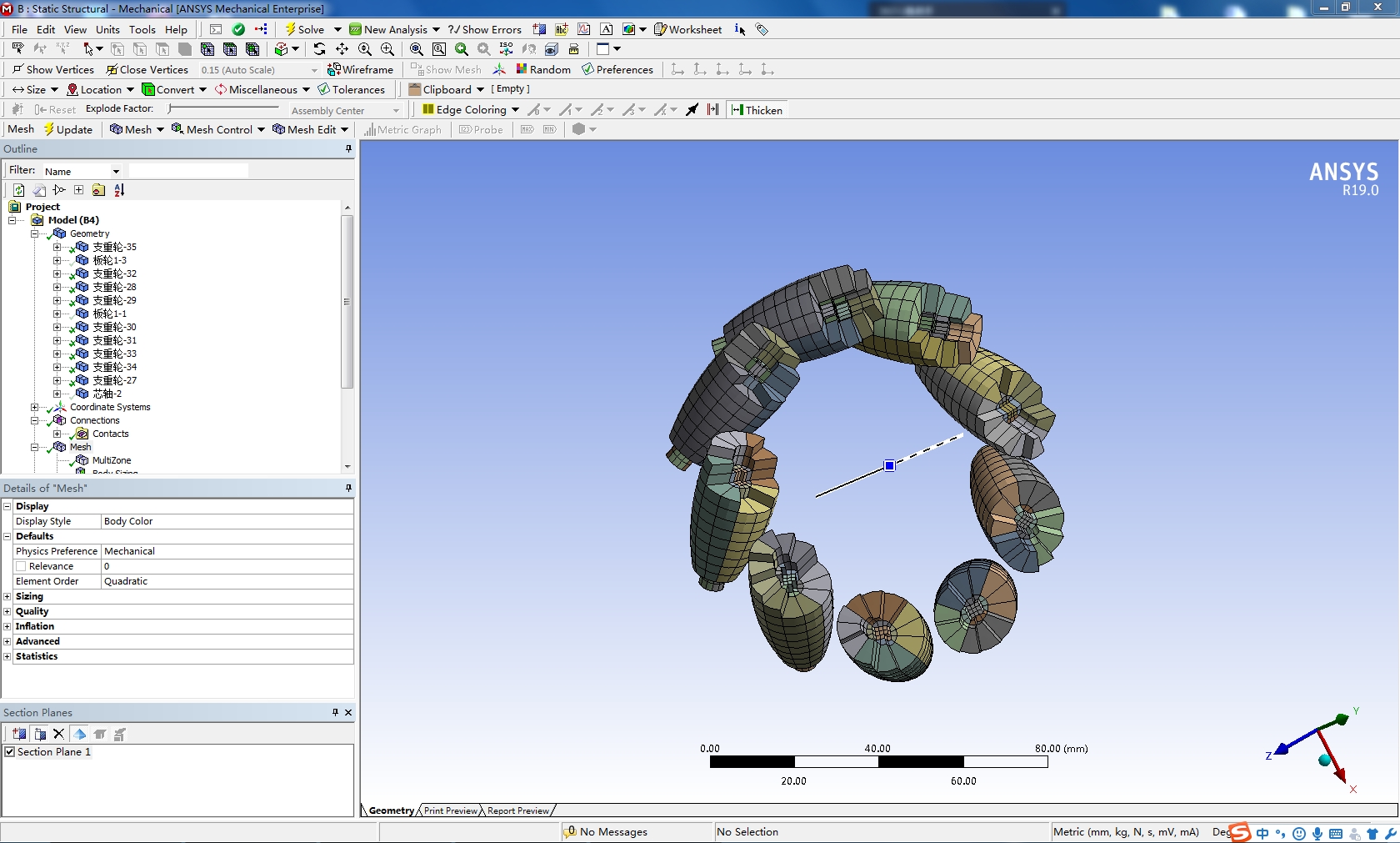 麦克纳姆轮采用solidworks2016建模,并且在soilidworks中切分、装配,导入ANSYS19.0中划分网格,附件为solidworks源文件和切分后源文件和装配文件,源文件的装配文件未装配好,但切分后的文件已检查,装配往后无损,另附划分的workbench源文件,现分享给大家学习,抛砖引玉。