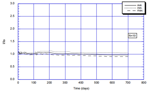 同时我们也要关注传感器的长期稳定性,这就要求传感器寿命足够长,更要求传感器输出长期稳定,不然会使报警值改变,造成早报晚报甚至不报等情况了。TGS5141的寿命长达十年以上,长期稳定性也是十分优秀,可以参考下图。(Y轴显示的是在任何时间点300ppm一氧化碳中的输出电流(I)和测试第一天300ppm一氧化碳中的输出电流(Io)的比值。)