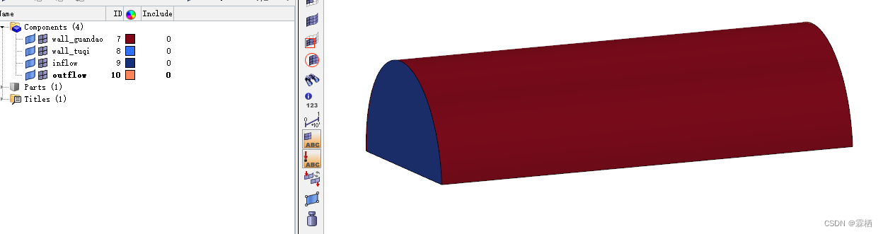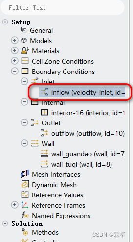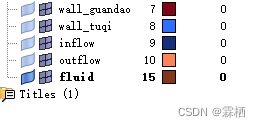 将各个面根据其边界条件类型的不同组织分布到不同的component里面,并按照类型进行命名,wall类型边界条件则将component的命名以wall为起始,入口类型边界条件以inflow为命名起始,出口类型边界条件以outflow为命名起始,流体网格则以fluid为命名起始,固体网格则以solid为起始,如下图。按照这种规则命名导入Fluent后边界条件类型可以被自动识别,只需调整其参数即可。