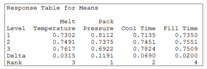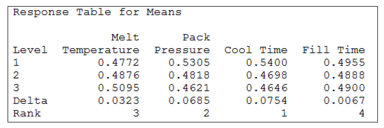 Plazology 接下来根据Moldex3D的分析结果,以统计软件Minitab 17找出四项控制因子中,何者对产品翘曲的影响最大。 从图三可看出,对翘曲量的影响最大的是冷却时间(Rank 1),其次依序是保压压力(Rank 2)、熔胶温度(Rank 3)和充填时间(Rank 4)。