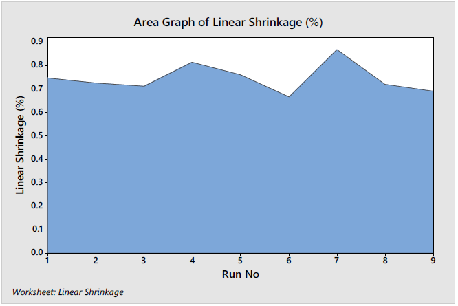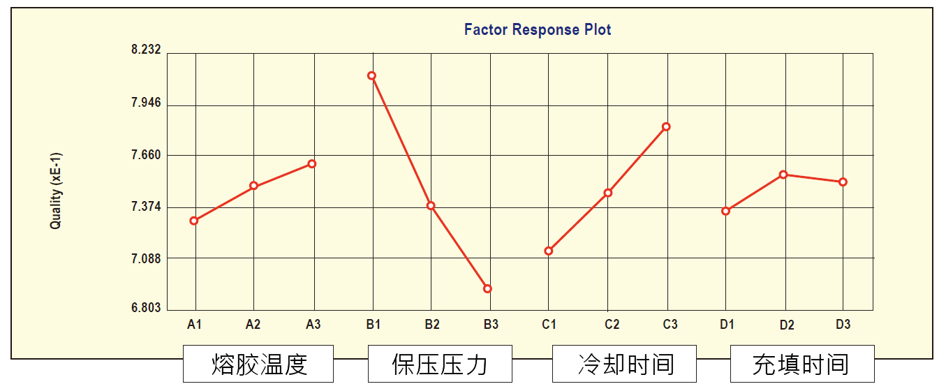 接着一样使用Minitab来找出四项因素中,何者对线性收缩的影响最大。根据图七的结果,保压压力是最大的影响因素,其次则依序是冷却时间、熔胶温度和充填时间。