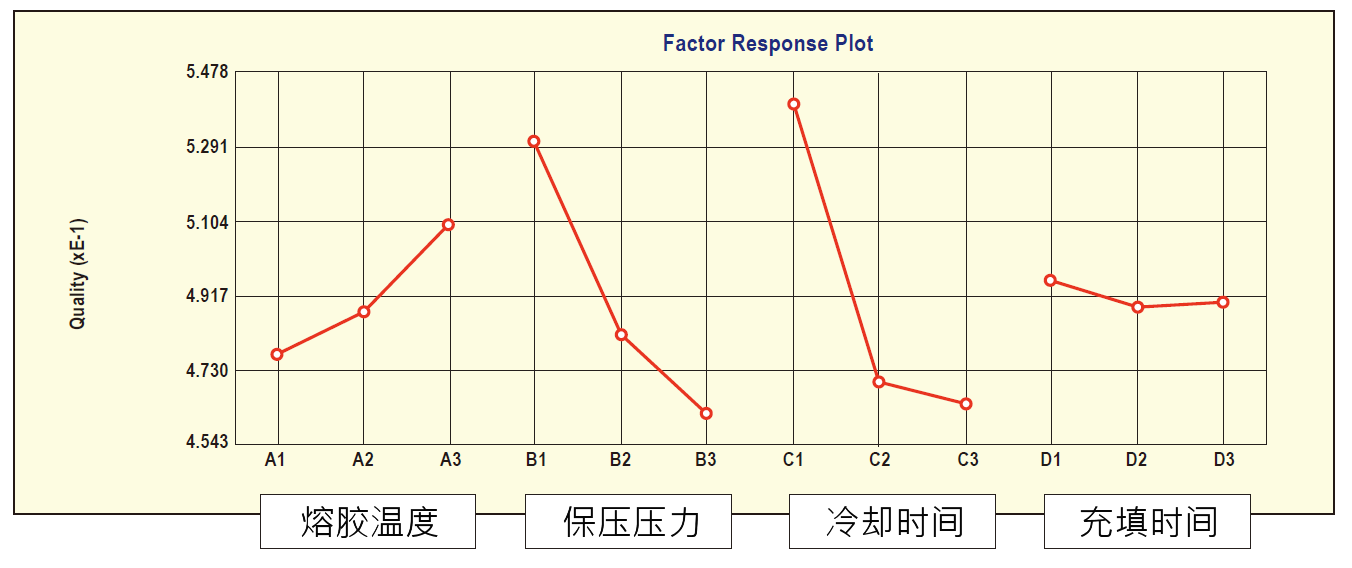 从 图六可观察 到,若要有较佳的真圆度 ( 或较小的线性收缩 ) ,就需要较低的熔胶温度、较短的冷却和充填时间,以及较大的保压压力。因此最佳 的制程设定 应为:熔胶温度 225°C 、保压压力 15MPa 、冷却时间 8 秒、充填时间 0.1 秒。然而由于 8 秒的冷却时间会导致较严重的翘曲 ( 根据图三的结果所示 ) ,此设定并不可行。