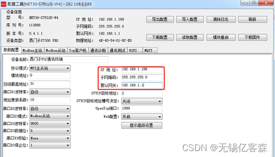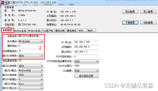 【 协议 模式】:连接西门子PLC的通讯口,西门子S7200/200SMART选择PPI模式,S7300/400选择MPI主从站模式;