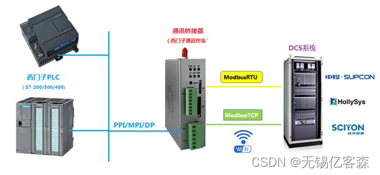 西门子PLC(S7200/300/400/200SMART)通过桥接器可以支持ModbusRTU串口和ModbusTCP以太网(有线和无线 WIFI 同时支持)两种通讯方式连接DCS系统,不需要编程PLC通讯程序,直接在模块中进行地址映射。支持浙大中控,和利时等主流DCS系统。