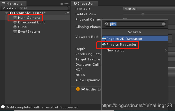 2、给摄像机添加Physics Raycaster脚本(系统自带的):选中Main Camera-》Add Component-》Physics Raycaster