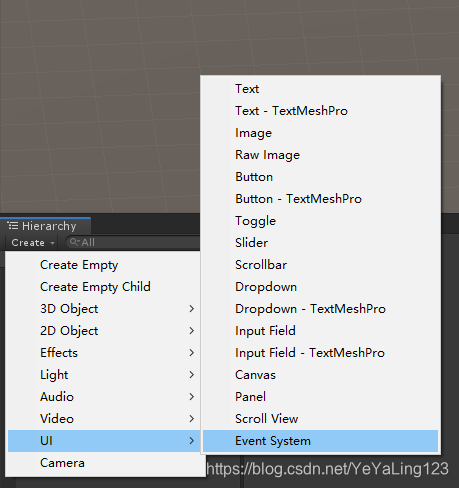 1、给场景添加EventSystem:选择 Hierarchy 窗口-》Create-》UI-》Event System