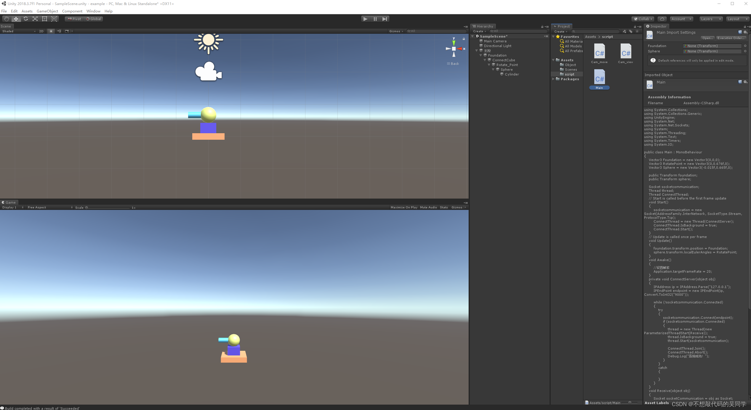 做到这一步,这个小demo就完成了,还有一些其他相关的细节及操作我会在有时间时记录下来,如物体结构较为复杂,实现多功能运动,运动指令的编码解码,鼠标控制相机视角的转换等等。当然作为新人博主,此demo也有很多可以改进的地方,希望各位不吝赐教,一起共同进步。