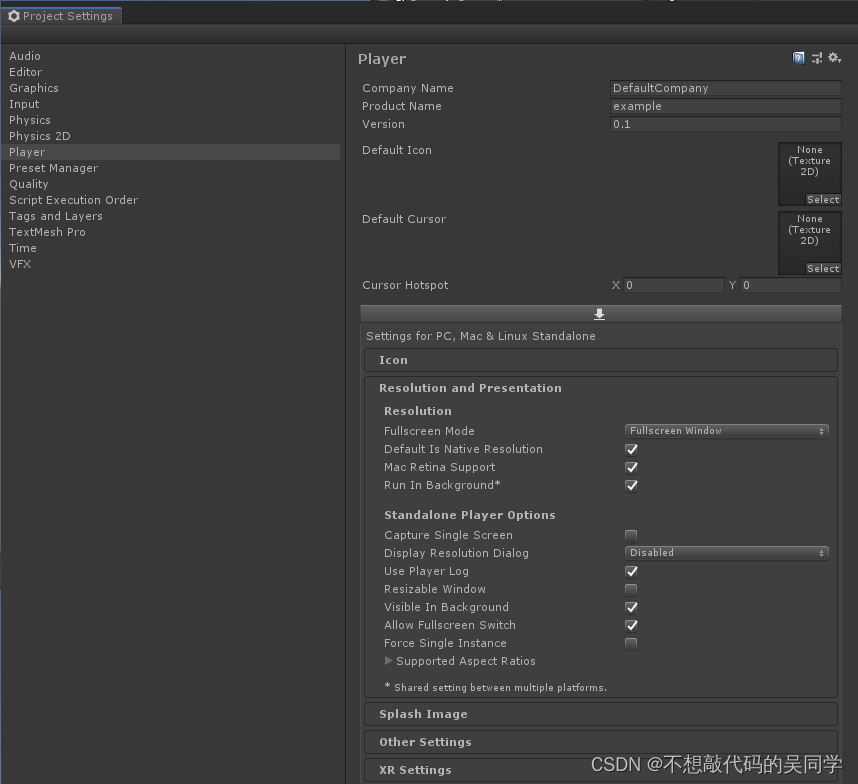 首先在Unity菜单栏 Assets 选项中选择Project Setting,将Display Resolution Dialog选项更改为Disabled,如下图所示: