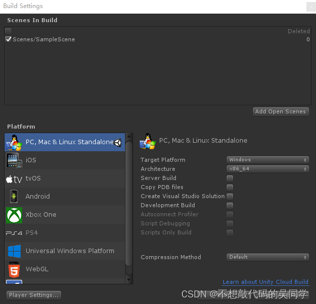 然后在菜单栏里File选择 Build Settings,如下图所示,导出到目标文件夹下即可(此处是WPF的文件夹里bin/debug/Unity,可见注意事项1)